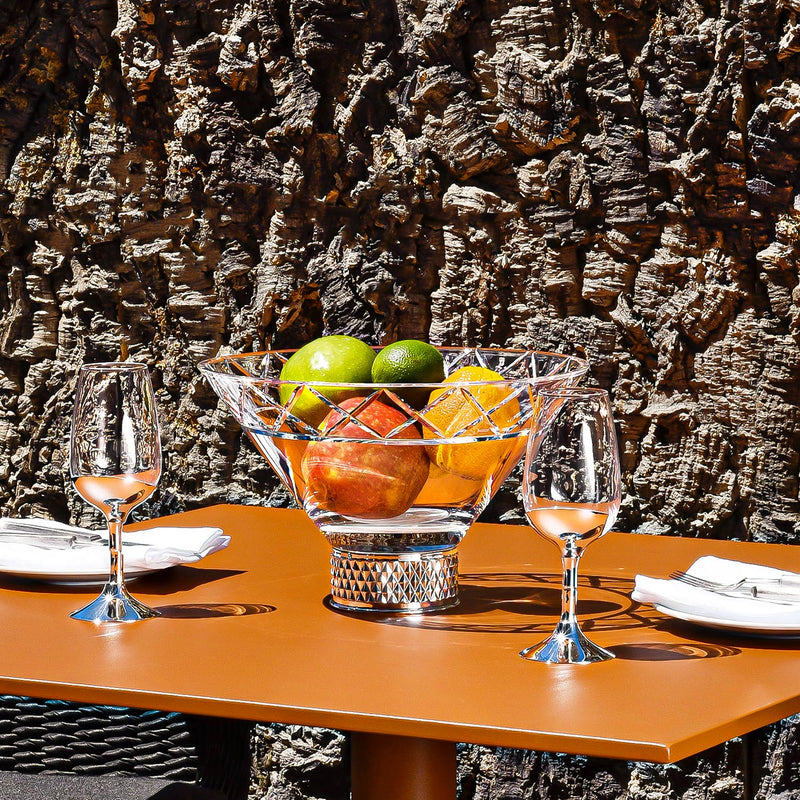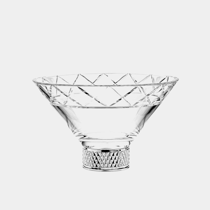 Decorative bowl made of cut glass with silver-plated metal base.
