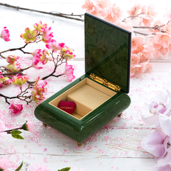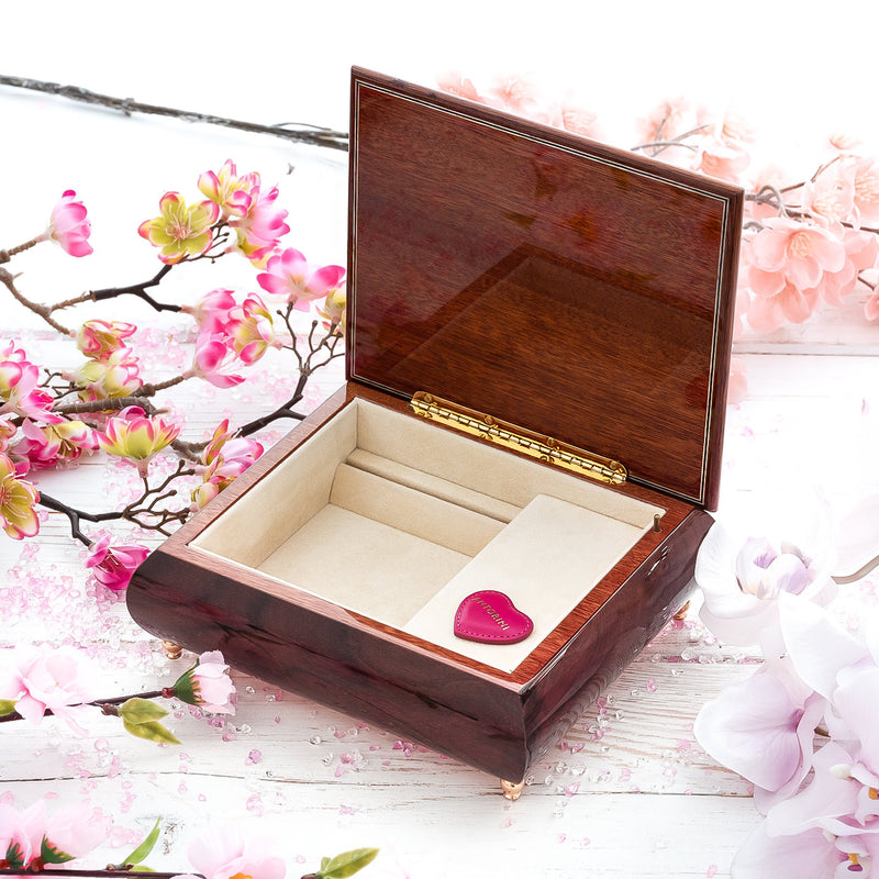 Thanks to the built-in mechanical movement, when the lid of the jewelry box is opened, an 18-tone melody starts playing.