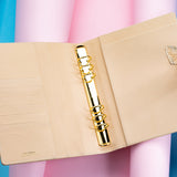 The gold-plated ring mechanism adds a touch of elegance and sophistication, while the beige interior is lined with plenty of handy pockets for all your organizational needs. This includes a notepad on the right, with ring refills and a calendar - perfect for keeping track of your schedule and staying on top of your to-do list.