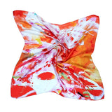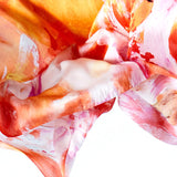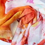 Item Code: ANT-140-orangeBeautiful ladies scarf made from soft and lightweight silk. All tones of red, yellow, and pink are depicted on the white base. All shades give the scarf absolute harmony. Handmade in Italy with the use of 100% Italian silk.