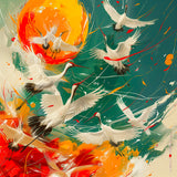 Item Code: ANT-SILK-MCRANESIntroducing a luxurious silk scarf crafted in Italy from the finest Italian twill silk, sourced from the renowned silk town of Como. This elegant accessory features a breathtaking design that celebrates nature and artistry. The vibrant pattern showcases graceful Japanese cranes in flight, symbolizing peace and longevity, set against a dynamic background of swirling colors and abstract elements. The rich hues of green and fiery oranges, along with the radiant sun in the backdrop, create a mesmerizing contrast, making this scarf a true statement piece. Perfect for elevating any outfit, it embodies timeless elegance and the highest craftsmanship.