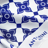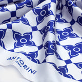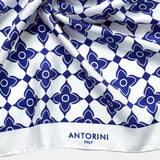 Item Code: ant-scarf-1369Inspired by modern-day geometric artists, we are proud to introduce this marvelous Italian hand-finished, 100% silk scarf. Stylish Blue motif design on a white background. Handmade in Como Italy using 100% Italian silk and beautifully finished by hand with finely rolled hand-stitched edges.