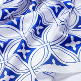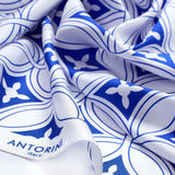 Item Code: ant-scarf-geometric-2Ladies silk scarf handmade in Italy using only 100% Italian silk. A subtle artistic cobalt blue geometric motif over a white background gives this scarf a captivating look. Finished by hand with finely rolled hand-stitched edges.