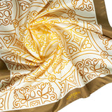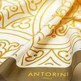Item Code: ant-scarf-1415Inspired by the legends of the ancient Silk Route of the Orient, this beautifully crafted Italian 100% Silk scarf comes with a golden motif on a white background with an olive border. Handmade in Italy with the use of 100% Italian silk. Finished by hand with finely rolled hand-stitched edges.
