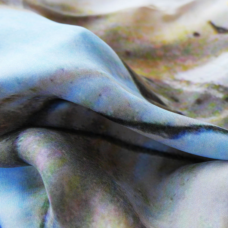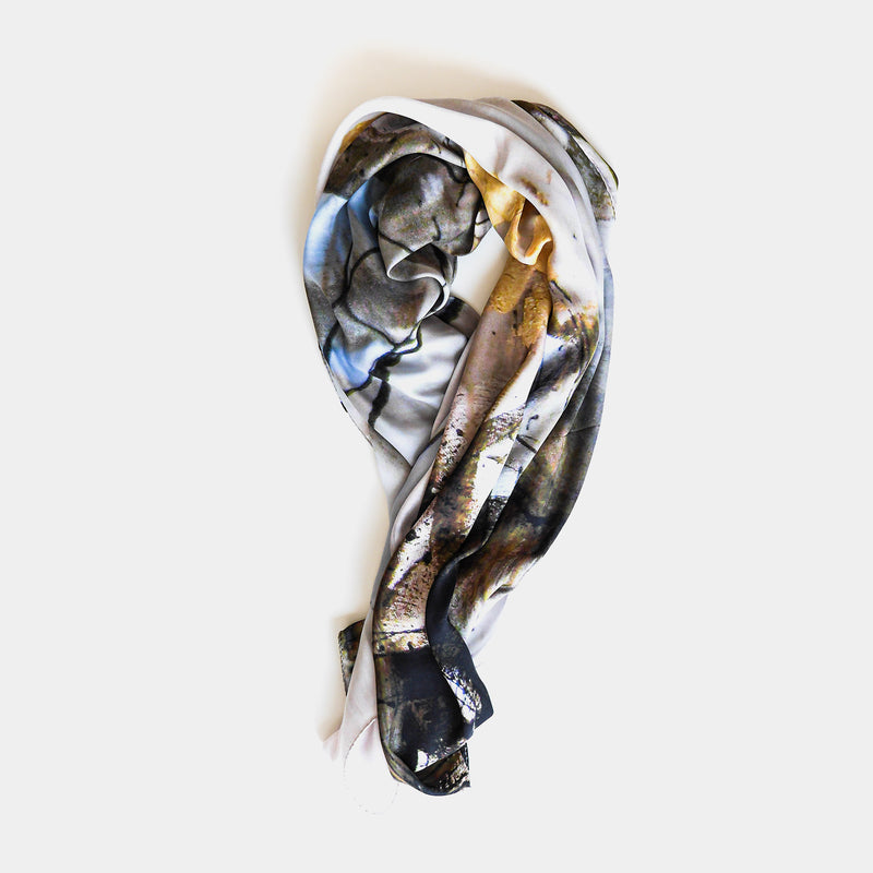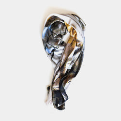 Item Code: ant-bgga-90Beautiful ladies' 90 cm scarf made from Italian lightweight silk in a limited edition. The most colorful harmony of tonal shades of pure gold and black on a dove grey background. All leafy shades give the scarf absolute harmony and can symbolize a cool autumn day. Perfect and elegant for wearing in all situations. Handmade in Italy with the use of 100% Italian silk. Finished by hand with finely rolled hand-stitched edges.