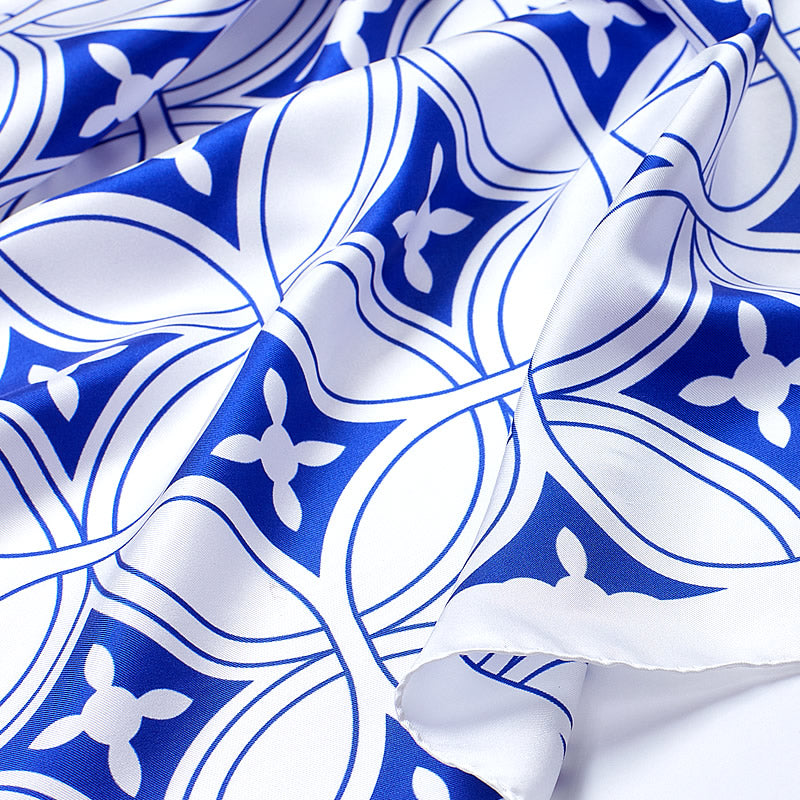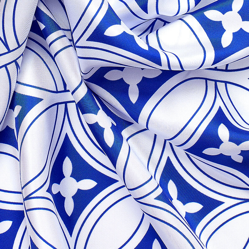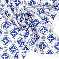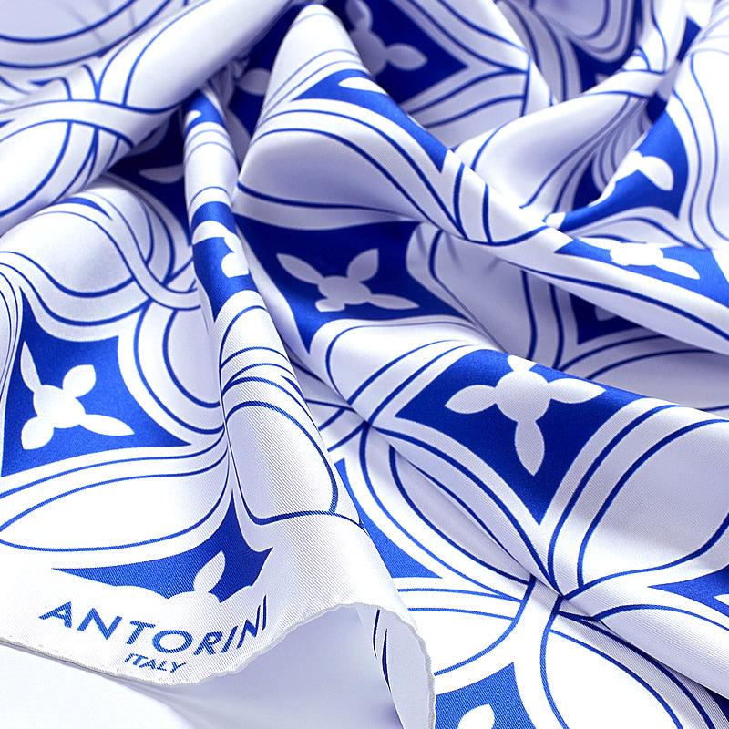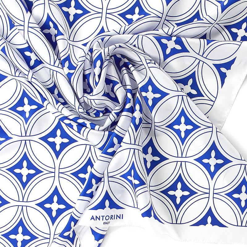 Item Code: ant-scarf-1316Ladies' pure silk scarf is a fine addition to any woman's wardrobe. Handmade in Italian Como, using only 100% Italian silk. Cobalt blue geometric motif over a crisp winter white background gives this scarf an attractive look. Beautifully finished by hand with finely rolled hand-stitched edges. With its elegant look and feel, this scarf is perfect for wearing on all occasions.