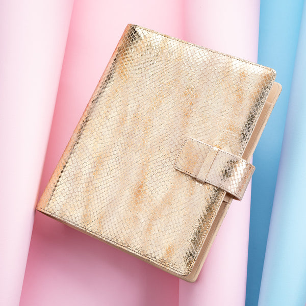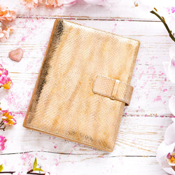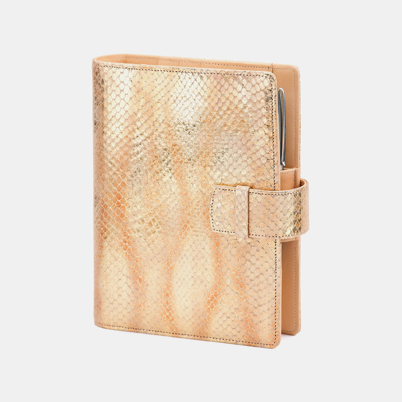 Six Ring A6 Planner 2026 ESSENCE in Gold leather with snake pattern.