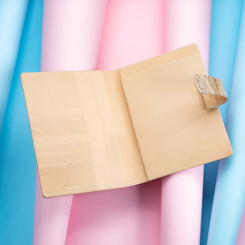 - Right inner side of the cover: vertical pocket covering the entire length, horizontal pocket for notes or for a notepad (notepad included), eyelet for a writing pen made of leather, and rubber band allowing you to attach writing instruments of various widths