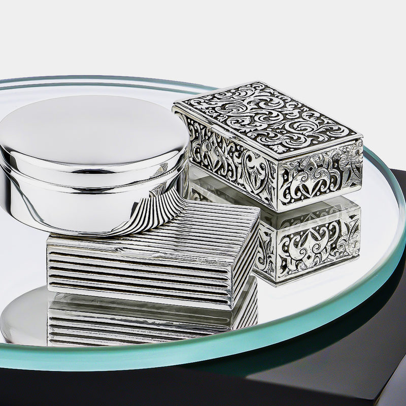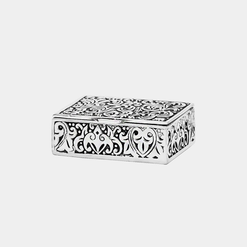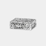 A pill box or keepsake box for first hair, teeth, or other small keepsake objects. The box with one compartment is richly decorated with ornaments.