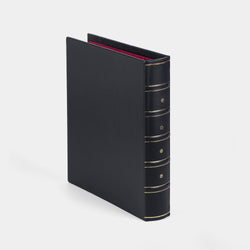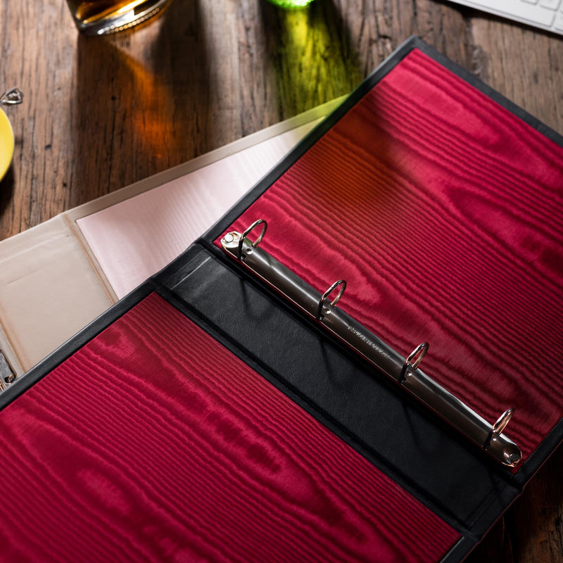 Luxury leather A4 ring binder in black & red color combination made by traditional handmade bookbinding technique. Traditional processing techniques and quality Italian leather lend the binder a unique look, a touch of history, and luxury.