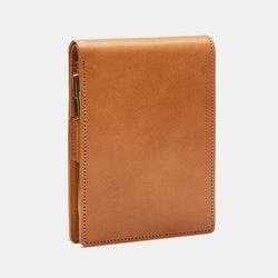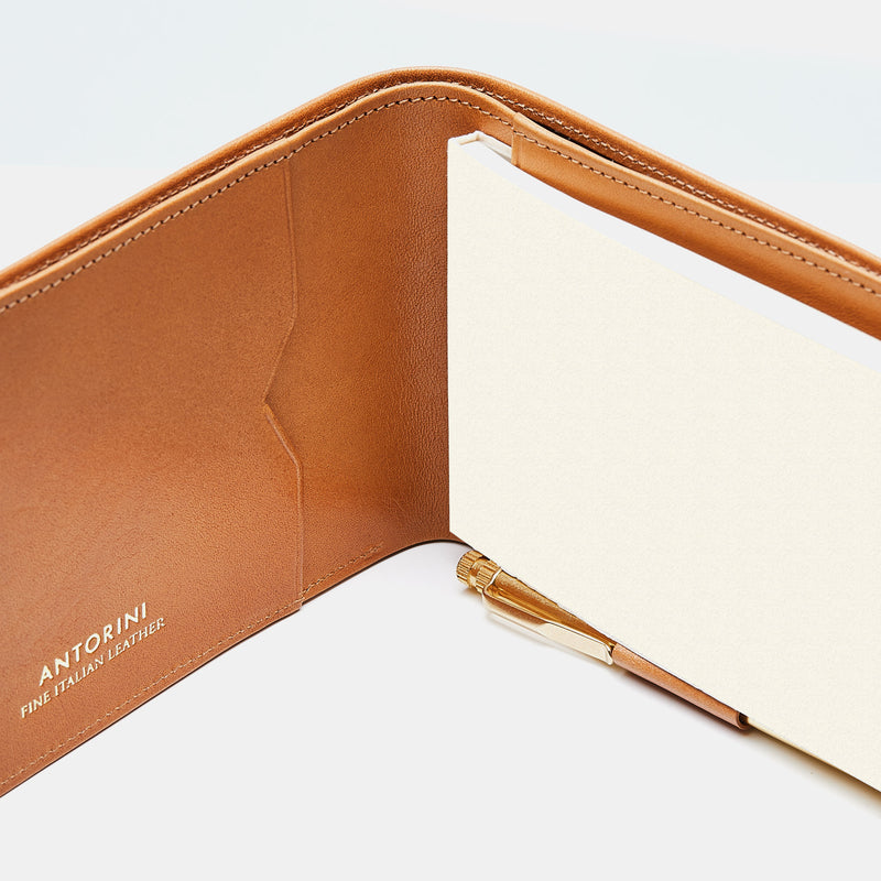 Item Code: ant-note-camelThis camel brown color ANTORINI Pocket Notepad offers practicality in a mini notebook crafted by Italian masters using top-quality leather. Its ivory paper notepad and mini pen make it perfect for note-taking, while a dedicated pocket holds business cards, and a full-length bill pocket is ideal for storing money and notes. Its stylish design fits easily in your pocket, making it the perfect tool for preserving your ideas.
